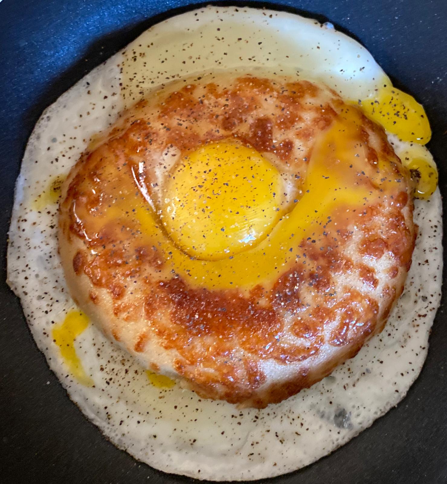 - Fry the bagel and egg until the egg white is set but the yolk is still runny, then lift it out of the pan onto a plate